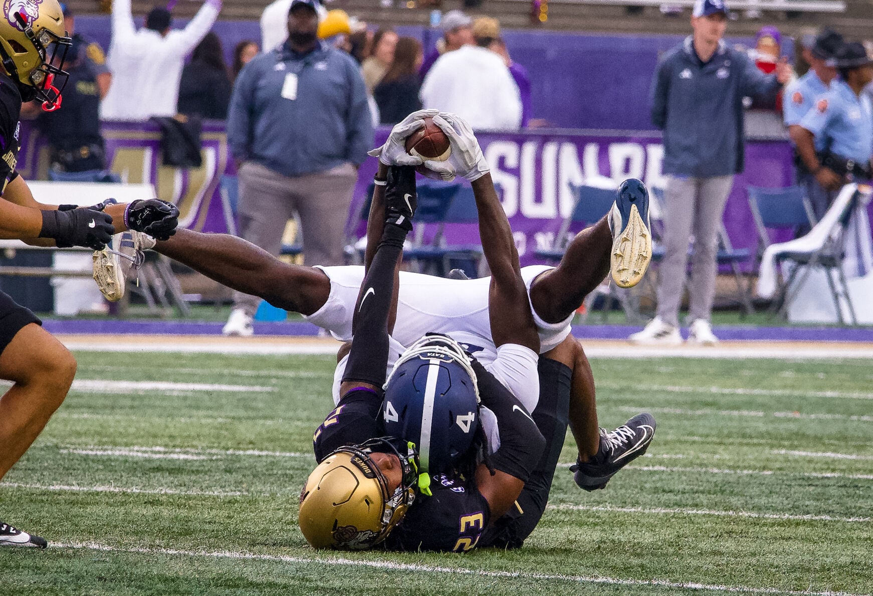 Place Name: First Place Contestant Name: The Breeze Entry Title: JMU Tackle Entry Credit: Annabel Dewey Judge Comment: This is just a fantastic catch...by the receiver and the photographer.